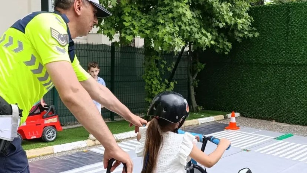Eğitimimizde trafik ışığı kuralları,yaya önceliği,kask ve koruyucu ekipman kullanımı ve bisiklete binme kuralları eğitimini aldık
